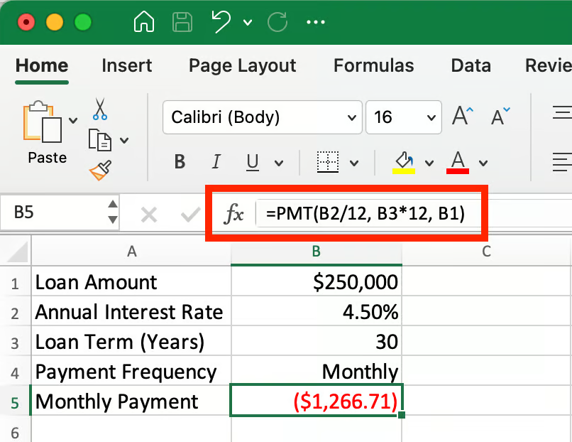 Na célula B5, calcule o pagamento mensal usando a função PMT: =PMT(B2/12, B3*12, B1). Isso retornará -$1.266,71. O sinal negativo indica uma saída de caixa.