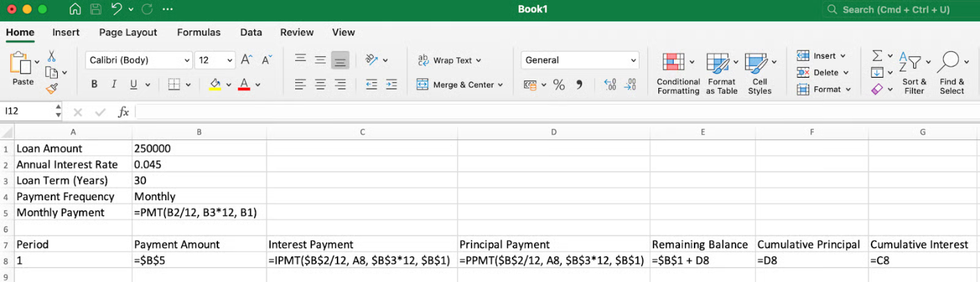 Configure seus cabeçalhos (Período, Pagamento, Juros, etc.) e insira as fórmulas para o primeiro período de pagamento. Lembre-se de usar referências absolutas ($B$1) para entradas fixas.