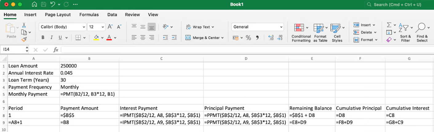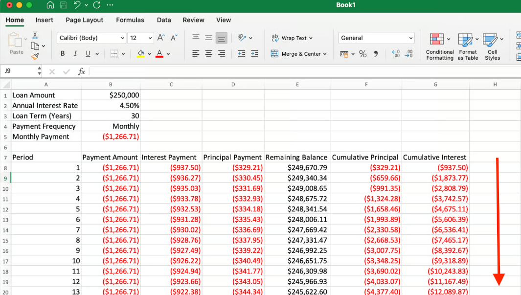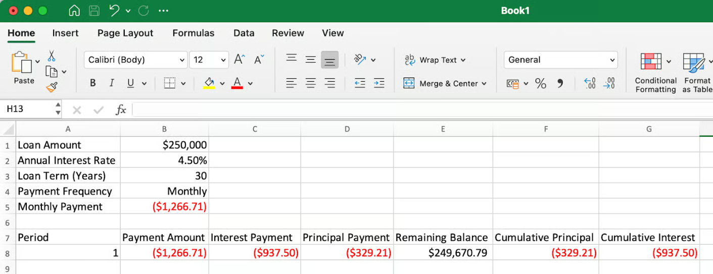 Vamos construir uma tabela de amortização do zero para um empréstimo de $250.000 em 30 anos a uma taxa de juros de 4,5%.