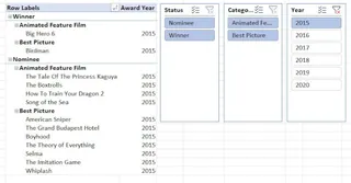Um beispielsweise nur die Ergebnisse von 2015 in einer Filmpreis-Pivot-Tabelle zu sehen, würden Sie einfach auf "2015" im Jahr-Slicer klicken. Die Pivot-Tabelle aktualisiert sich sofort. Das ist unbestreitbar nützlich.